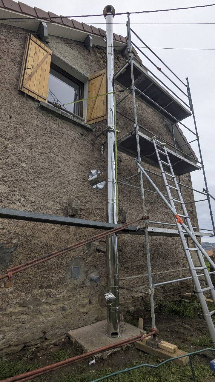 Dans le cadre de ce chantier, nous réalisons la mise en place complète d’un conduit de fumée double paroi isolé en inox, installé en façade extérieure. Ce conduit permettra d’assurer le raccordement d’un poêle déjà en place, dans une maison en pisé comptant deux niveaux.